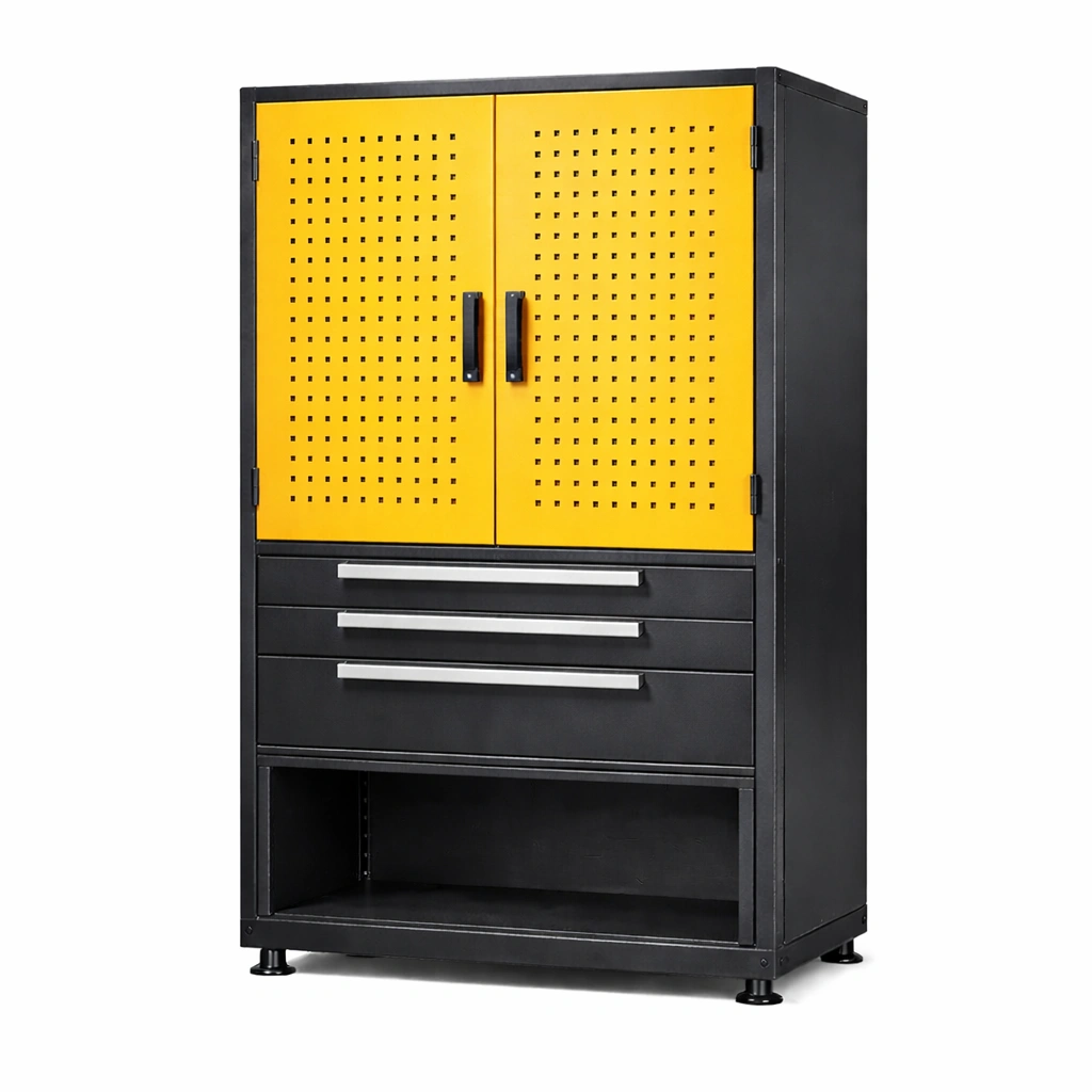 Armadio portautensili in metallo nero e giallo con cassetti e ante forate