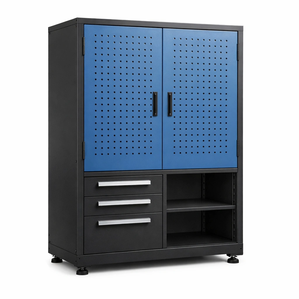 Armadio portautensili in metallo con ante blu e cassetti neri 180x90x40 cm