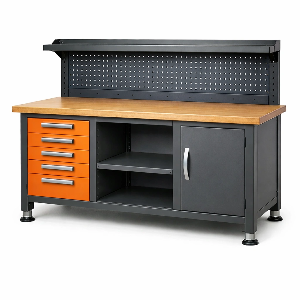 Banco da lavoro in metallo con piano in legno di quercia e cassetti arancioni