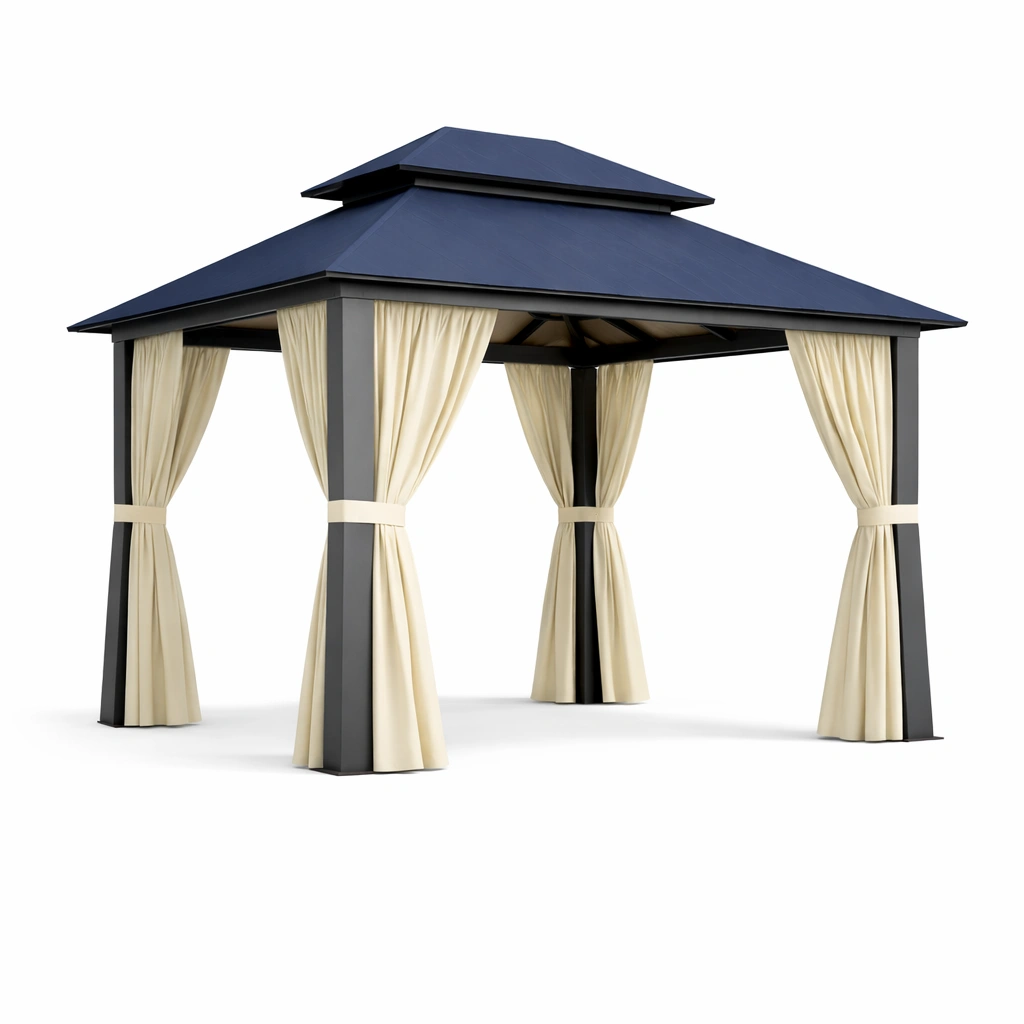 Il gazebo è composto da una struttura in metallo verniciato e un telo in poliestere blu. Le tende laterali, anch'esse in poliestere, sono di colore beige.